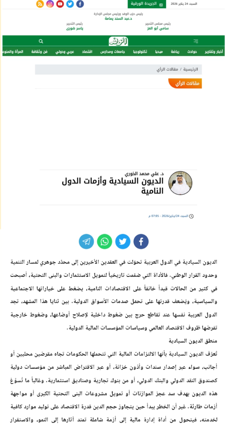 Ultimately, sovereign debt cannot be treated as a purely financial issue to be managed behind closed doors between finance ministries and banks. Rather, it is a matter of sovereignty and development, linked to a nation’s ability to manage its resources, shape its future options, and safeguard its economic independence. For developing countries in general, the greatest challenge lies in transitioning from a rentier or consumer-based economic model, reliant on volatile external flows, to a sustainable, productive model grounded in knowledge, innovation, and the development of social and economic opportunities. In the Arab world, overcoming the debt crisis will be impossible without broad structural reforms and long-term strategic visions that prioritize economic diversification, human development, and genuine Arab cooperation. Otherwise, the region will remain trapped in a recurring cycle of borrowing, crises, and restructuring.
