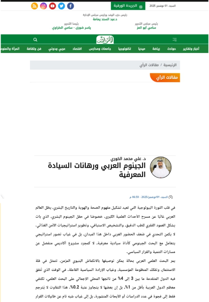 ما يجب التفكير فيه بعمق هو: لماذا لا نُعامل الجينوم بوصفه بُعدًا من أبعاد الهوية العربية؟ ولماذا لا يُنظر إلى التنوع الوراثي كأصل استراتيجي يُبنى عليه خطاب علمي مستقل؟ إن ما نفتقده اليوم ليس مجرد تمويل أو بنى تحتية، بل رؤية تنقلنا من موقع المستهلك للمعلومة الجينية إلى موقع المنتج للمعرفة البيولوجية. وحين يتم ذلك، لن يكون الجينوم العربي مجرد مشروع علمي، بل أفقًا جديدًا لإعادة تعريف علاقتنا مع العالم، ومع أنفسنا.