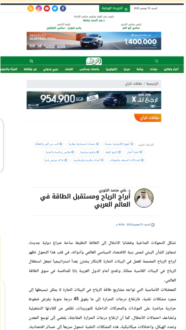 وعليه، فإن مستقبل أبراج الرياح المقاومة للحرارة يُمثّل لحظة مفصلية في التاريخ العربي الحديث، إذ يتيح تحويل الصحراء من فضاءٍ طالما ارتبط بالفراغ المناخي والهامشية الاقتصادية إلى ركيزة من ركائز القوة الاستراتيجية. فالمسألة لم تعد مساراً تقنياً يقتصر على تحسين كفاءة التوربينات، بل تحوّلت إلى مشروع أشمل يعيد تعريف علاقة الجغرافيا العربية بالتحولات الكبرى التي تعصف بالعالم. الأرض القاحلة التي كانت عائقاً بنيوياً أمام التنمية يمكن أن تتحول إلى منصة لإنتاج الثروة وإعادة صياغة موازين النفوذ. ومن هذا المنظور، فإن الاستثمار في هذه التكنولوجيا يتجاوز البعد المرتبط بالطاقة ليصبح استثماراً في الحضور الدولي للعرب، وفي بناء موقع فاعل لهم داخل النظام العالمي الجديد للطاقة، حيث تُعاد كتابة قواعد اللعبة الاقتصادية والسياسية للقرن الحادي والعشرين.