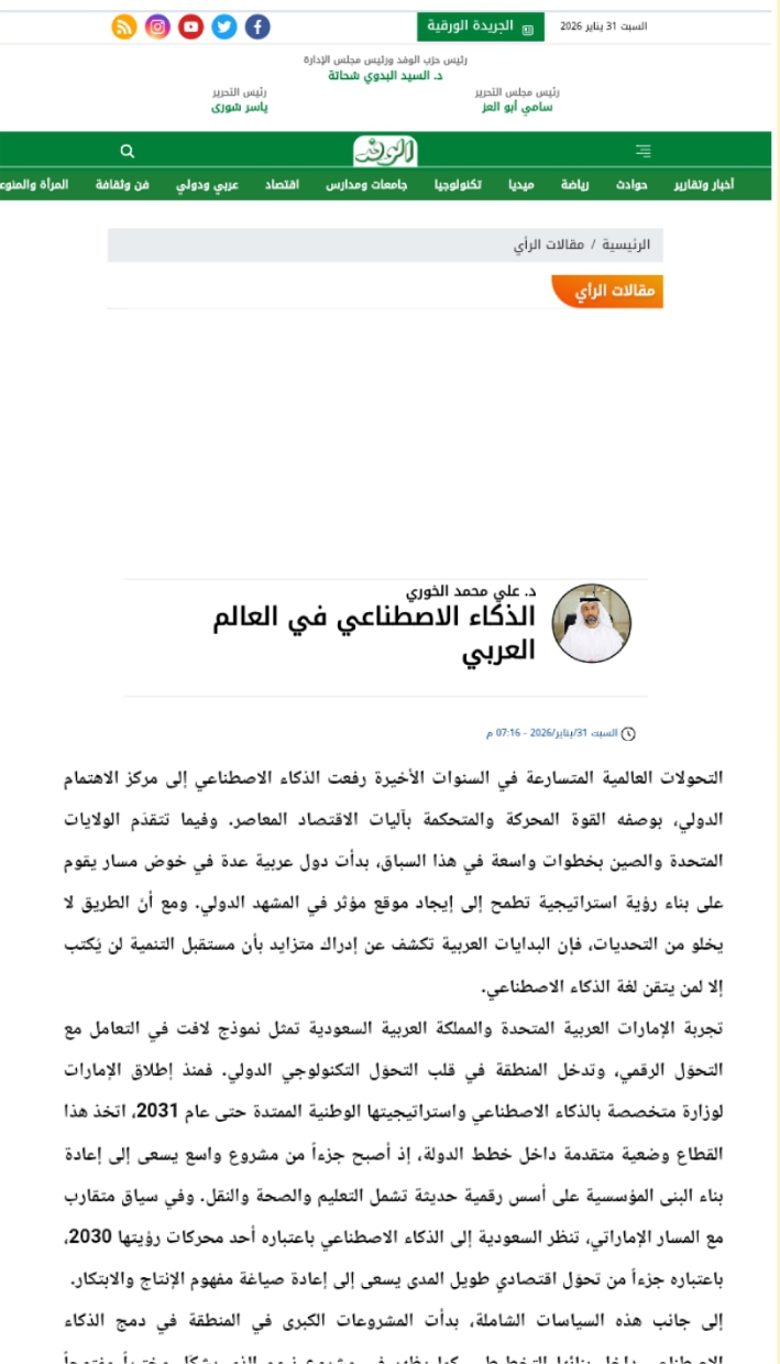التحولات العالمية المتسارعة في السنوات الأخيرة رفعت الذكاء الاصطناعي إلى مركز الاهتمام الدولي، بوصفه القوة المحركة والمتحكمة بآليات الاقتصاد المعاصر. وفيما تتقدّم الولايات المتحدة والصين بخطوات واسعة في هذا السباق، بدأت دول عربية عدة في خوض مسار يقوم على بناء رؤية استراتيجية تطمح إلى إيجاد موقع مؤثر في المشهد الدولي. ومع أنّ الطريق لا يخلو من التحديات، فإن البدايات العربية تكشف عن إدراك متزايد بأن مستقبل التنمية لن يُكتب إلا لمن يتقن لغة الذكاء الاصطناعي.