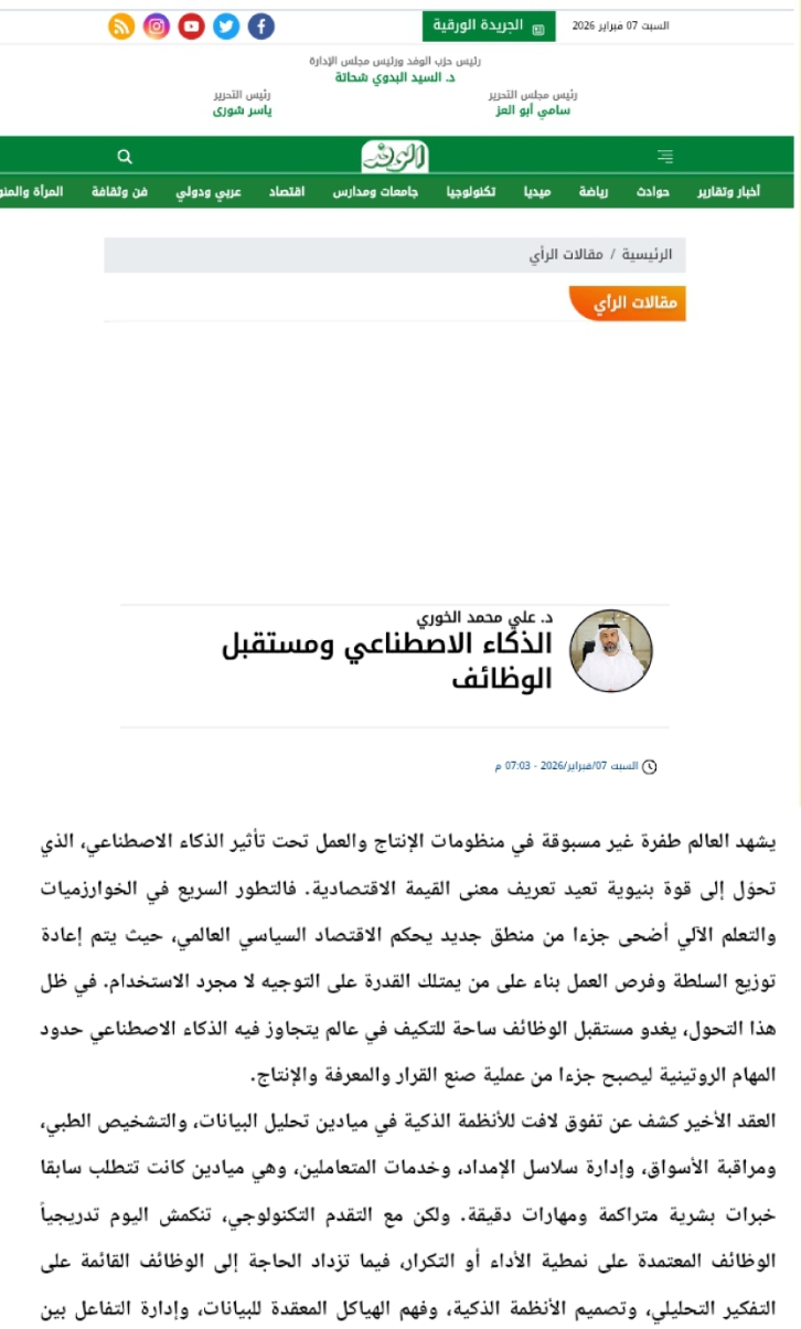 وعند التأمل فيما يجري عالمياً بشكل أعمق، يتضح أن الذكاء الاصطناعي يعمل على تغيير الأساس الذي تقوم عليه علاقة الإنسان بعمله. فقد تصبح الوظيفة في المستقبل أقل ارتباطا بالمهارة اليدوية وأكثر التصاقا بالقدرة على التفكير النقدي، والمزج بين المعرفة التقنية والفهم الاجتماعي. وربما يتطلب هذا تحولاً فلسفياً في تصور الدور الإنساني في الاقتصاد، وفي مفهوم القيمة، وفي ماهية المساهمة الفردية في الإنتاج داخل عالم تحكمه السرعة والابتكار.