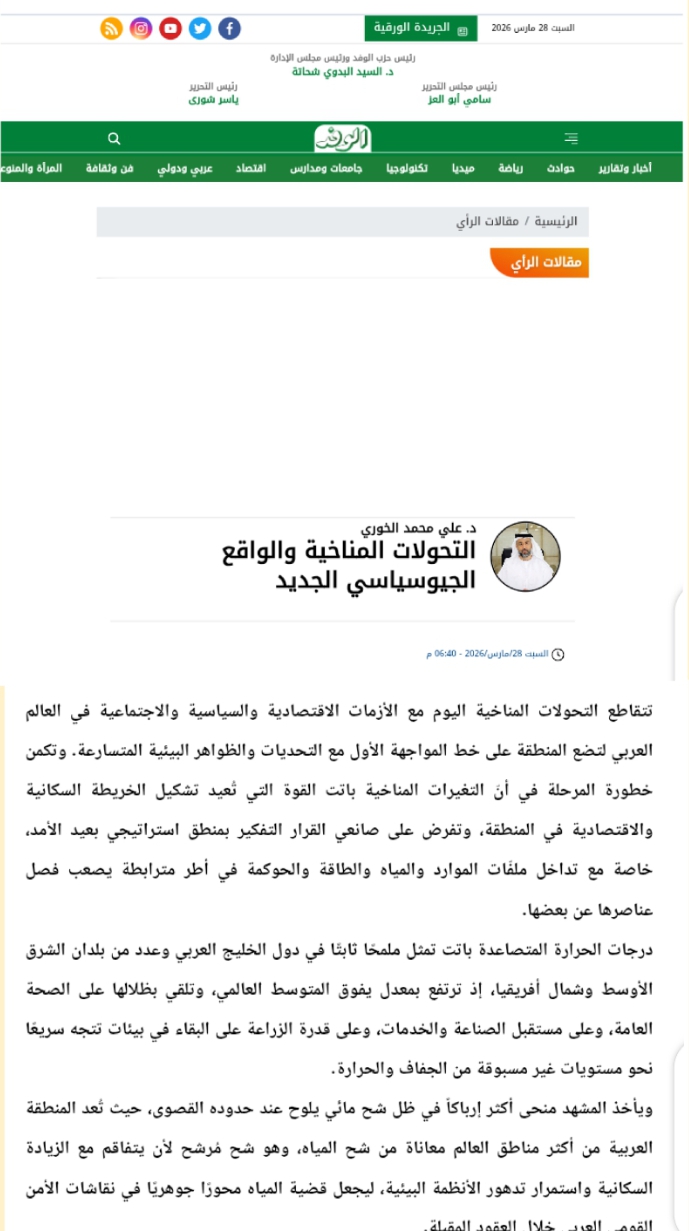 تتقاطع التحولات المناخية اليوم مع الأزمات الاقتصادية والسياسية والاجتماعية في العالم العربي لتضع المنطقة على خط المواجهة الأول مع التحديات والظواهر البيئية المتسارعة. وتكمن خطورة المرحلة في أنّ التغيرات المناخية باتت القوة التي تُعيد تشكيل الخريطة السكانية والاقتصادية في المنطقة، وتفرض على صانعي القرار التفكير بمنطق استراتيجي بعيد الأمد، خاصة مع تداخل ملفّات الموارد والمياه والطاقة والحوكمة في أطر مترابطة يصعب فصل عناصرها عن بعضها.