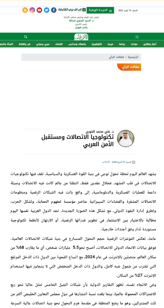 في المحصلة، لا يمكن فهم مستقبل القوة العسكرية والسياسية في القرن الحادي والعشرين من دون وضع تكنولوجيا الاتصالات في مركز التحليل. بالنسبة إلى العالم العربي، فإن الرهان الحقيقي لا يكمن في اقتناء أحدث المنظومات أو التوقيع على مزيد من العقود الدفاعية، بل في بناء قدرات ذاتية على إنتاج المعرفة التقنية، وصياغة قواعد استخدامها بما يخدم مصالحها الوطنية لا بما يكرر أنماط التبعية القديمة بصور رقمية أكثر تعقيدًا. هنا بالضبط هو ما سيحدد الفارق بين من يرى اليوم في الشبكات مجرد بنية تحتية، ومن يدرك أنها أصبحت اليوم أحد أهم مسارح التاريخ.